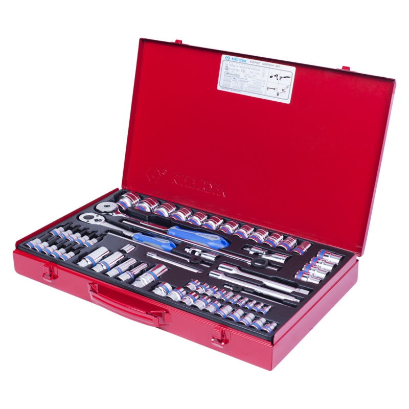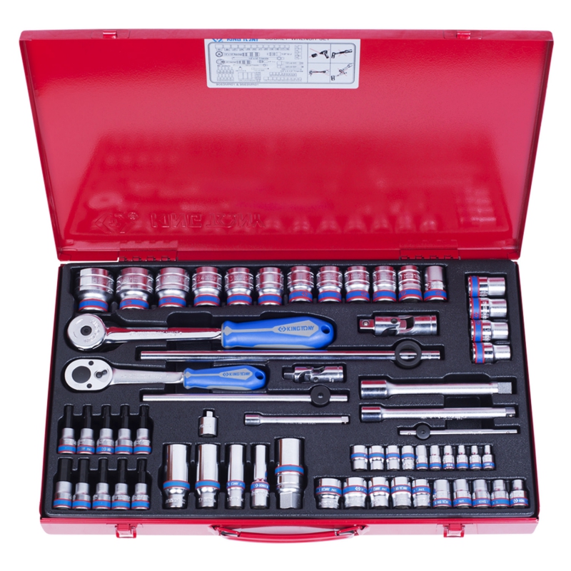 Торцевые головки двенадцатигранные размером от 4 до 32 мм в комплекте King Tony дополнены трещотками, карданами, воротками, удлинителями и другими аксессуарами, которые будут необходимы мастеру во время авторемонта. Большой набор из 62 позиций, упакованных в прочный и долговечный металлический кейс, будет приятно получить в подарок как любителю гаражных работ, так и профессиональному слесарю.