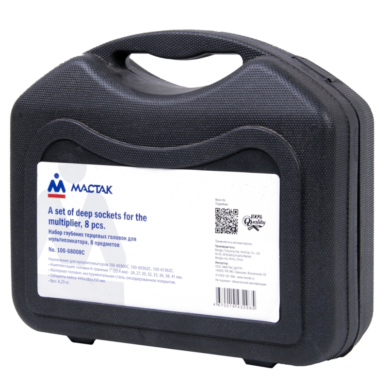 Головки ударные Мастак идеально подходят к мультипликатору. Аксессуары обладают высокой прочностью и устойчивостью к нагрузкам благодаря изготовлению из инструментальной стали. Оксидирование металла защищает от сколов, трещин и образования коррозии. Головки торцевые упакованы в легкий пластиковый кейс с ручкой, который защитит от попадания пыли.