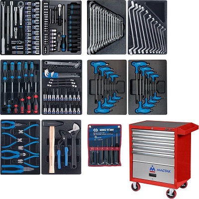 Набор инструментов на 5 выдвижных полках. Расположен в передвижной инструментальной тележке на ложементах из поливинилхлорида. Включает: торцевые головки с принадлежностями, L-образные, комбинированные и накидные ключи, отвертки и насадки, плоскогубцы и бокорезы, переставные клещи, разводой ключ, молоток и выколотки. Инструменты изготовлены из высокопрочных материалов. Подходят для применения при проведении профессиональных работ.