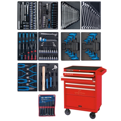 Набор инструментов в красной инструментальной тележке. Расположены на ложементах из ПВХ. Предназначены для оснащения ремонтных мастерских и СТО. В комплекте: торцевые головки и принадлежности, разрезные, накидные, L-образные и комбинированные ключи, шестигранники и отвертки, насадки, плоскогубцы, клещи бокорезы, разводной ключ и молоток, выколотки. Инструменты наделены повышенной износостойкостью.