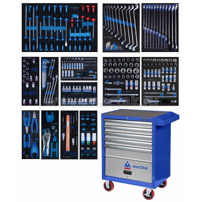 Набор инструментов в синей тележке. Используется при проведении ремонтных работ в мастерских и на СТО. В комплекте: торцевые насадки и головки, отвертки, накидные, разрезные и комбинированные ключи, плоскогубцы и зажим, клещи и бокорезы, зубила, выколотки и кернеры с молотком. Инструменты изготовлены из высокопрочной легированной стали. Способны выдержать повышенные профессиональные нагрузки.