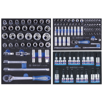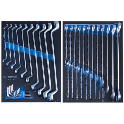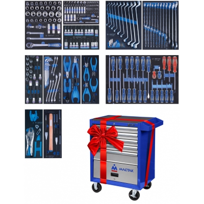 Набор инструментов для проведения ремонтных работ. Расположен в инструментальной тележке синего цвета на ложементах из ЭВА. В составе: торцевые головки и насадки с принадлежностями, комбинированные, накидные и разрезные ключи, отвертки и шестигранники, плоскогубцы и зажимы, бокорезы и клещи, кернеры с молотком, зубила и выколотки. Инструменты обладают повышенной прочностью. Способны выдержать профессиональные нагрузки.