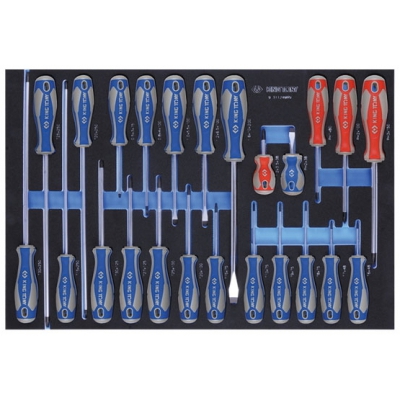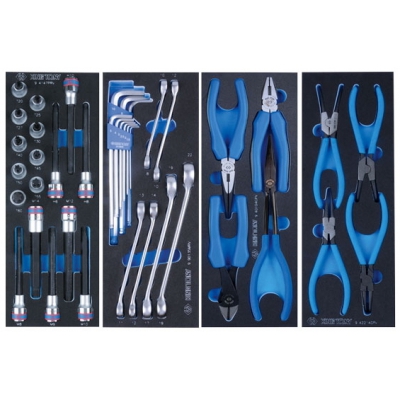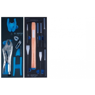 Набор инструментов на 5 выдвижных полках. Располагается на ложементах в инструментальной тележке. Включает: торцевые насадки и головки с принадлежностями, разрезные, накидные и комбинированные ключи, отвертки и шестигранники, плоскогубцы и бокорезы, клещи и зажим, выколотки, зубила и кернеры с молотком. Инструменты изготовлены методом высокотемпературной обработки из легированной стали. Наделены повышенной прочностью. Возможно применение на СТО и в мастерских.