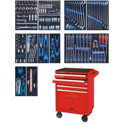 Набор инструментов для проведения разнообразных ремонтных работ. Предназначен для оснащения СТО и мастерских. Располагается в инструментальной тележки с колесами и выдвижными полками. В наборе: торцевые насадки и головки с принадлежностями, разрезные, накидные и комбинированные ключи, отвертки и шестигранники, плоскогубцы и бокорезы, клещи и зажим, выколотки, зубила и кернеры с молотком. Металлические части изделий выполнены из прочного хром-ванадиевого сплава.