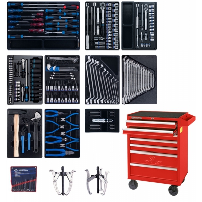 Набор инструментов в красной передвижной тележке. Предназначен для оснащения ремонтных мастерских и автосервисов. Включает: торцевые головки и принадлежности, отвертки и шестигранники, насадки, съемники клипс, стопорных колец и подшипников, разрезные, комбинированные и накидные ключи, выколотки, бородки и кернеры. Инструменты расположены в 7 выдвижных полках. Обладают повышенной прочностью и износостойкостью.