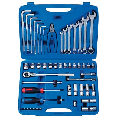 Набор универсальных инструментов фирмы King Tony. Включает шестигранные свечные и торцевые головки, трещотку, удлинители и переходники, комбинированные ключи, отвертки и шестигранники, плоскогубцы и вставки (биты) в форме звезды. Размер посадочного квадрата изделий - 3/8 дюйма. Все инструменты выполнены из специального хромованадиевого сплава и наделены повышенной прочностью. Комплект поставляется в надежном кейсе из пластика для удобства использования.