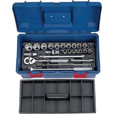 Набор с комплектующими для работы с резьбовыми соединениями и деталями. Посадочный квадрат - 1/2 дюйма. Все изделия изготовлены из специального хром-ванадиевого сплава. Отличаются особой повышенной прочностью и износостойкостью. В комплекте: свечные и торцевые головки, удлинители и переходник для достижения труднодоступных креплений, воротки и трещотка. Комплект расположен в удобном ложементе для хранения и кейсе с ручкой для переноски.