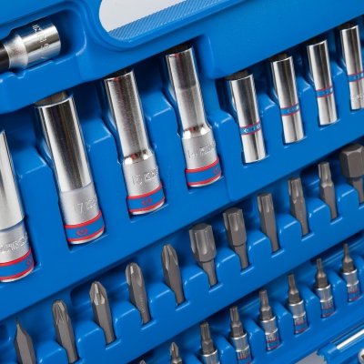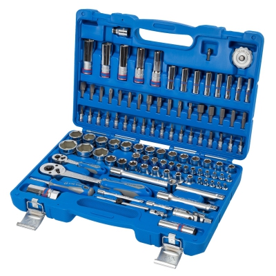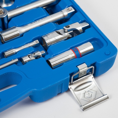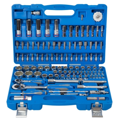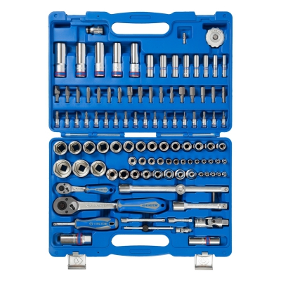 Набор инструментов в пластиковом кейсе. Предназначен для различных работ в быту или в мастерских. Включает торцевые и свечные головки разного посадочного квадрата, трещотки и воротки, удлинители и переходники, карданы, держатели бит, отвертки-воротки, вставки и шестигранники. Изделия наделены повышенными физическими свойствами. Способны выдержать максимальные нагрузки.