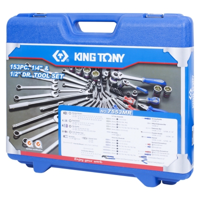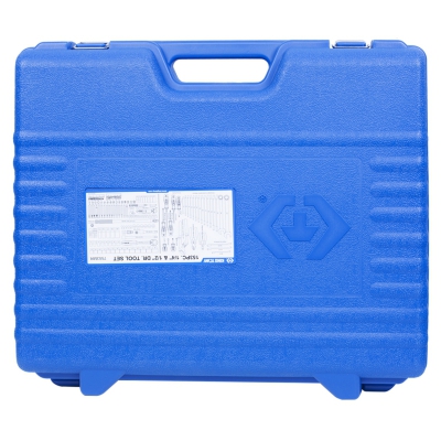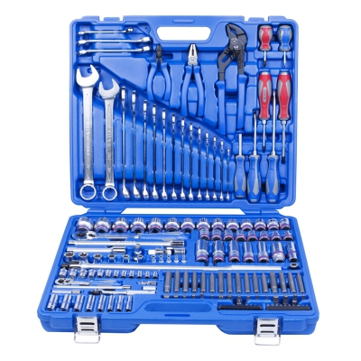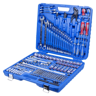 Набор инструментов в чемодане с металлическими защелками. В состав входят: торцевые и свечные головки, трещотки и воротки с шарниром, карданы и удлинители, держатели бит, комбинированные и разрезные ключи, крестовые и шлицевые отвертки, вставки с разнообразной посадкой, плоскогубцы и захваты, бокорезы. Комплект применяется при различных работах в быту или в ремонтных мастерских. Изделия способны выдержать повышенные нагрузки.