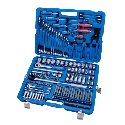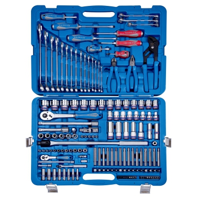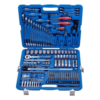 Набор инструментов с присоединительными квадратами комплектующих - 0,5 и 1/4 дюйма. Поставляется в ударопрочном пластиковом чемодане с металлическими защелками. В составе: свечные и торцевые головки, переходники и удлинители, карданы и трещотки, держатели вставок, разрезные и комбинированные ключи, крестовые и плоские отвертки, биты, плоскогубцы, захваты и бокорезы. Изделия применяются при работе различной сложности.