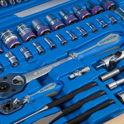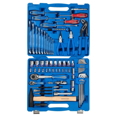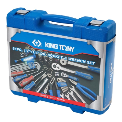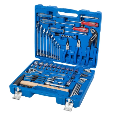 Универсальный набор инструментов и комплектующих из 81 предмета. Поставляется в удобном пластиковом кейсе с металлическими защелками. В составе: свечные и торцевые головки, трещотка и карданы, удлинители и держатель вставок, комбинированные ключи, крестовые и плоские отвертки, биты, наборы шестигранников, плоскогубцы и переставной захват, выколотка, зубило и кернер, фонарь и тестер напряжения, молоток. Комплект подходит для работ различного типа. Изделия изготовлены из прочной легированной стали.