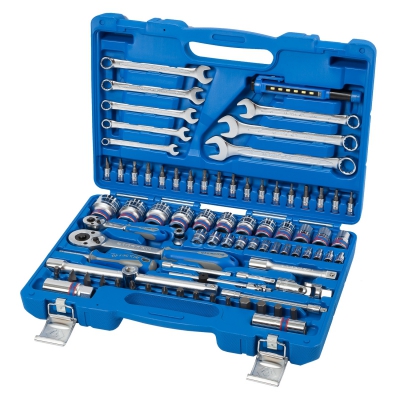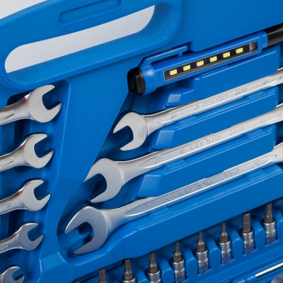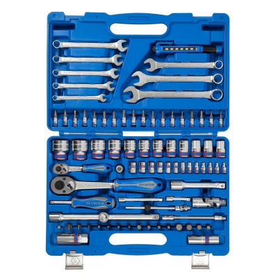 Набор инструментов с посадочным квадратом комплектующих - 0,5 и 1/4 дюйма. Подходит для различных работ любой профессиональной сложности. Содержит торцевые и свечные головки, трещотки и воротки, удлинители и переходники, карданы, комбинированные ключи, вставки и держатели к ним, светодиодный фонарь. В комплекте ударопрочный чемодан из специального пластика для удобства хранения и переноски.