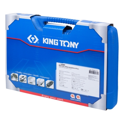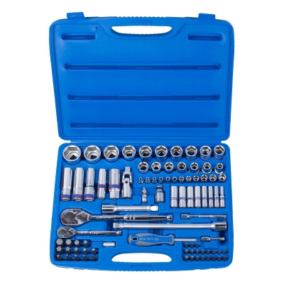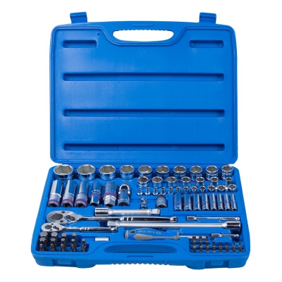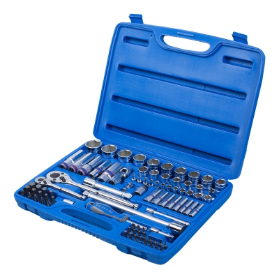 Универсальный набор из 86 предметов. Поставляется в ударопрочном пластиковом чемодане для хранения и транспортировки. В комплект входят: свечные и торцевые головки, трещотки, карданы и отвертка-вороток, удлинители, держатели бит, разнообразные вставки. Инструменты предназначены для различных работ в быту или в ремонтных мастерских. Оснащены маслостойкими рукоятками из двухкомпонентного материала.