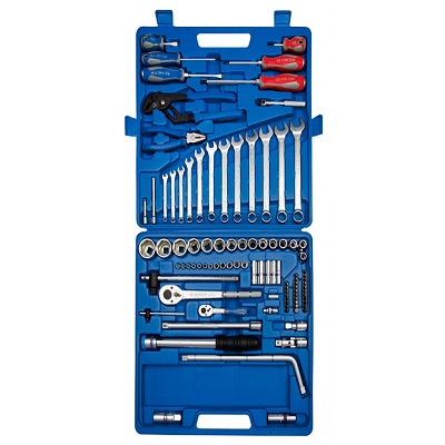 Универсальный набор с посадочными квадратами комплектующих - 0,5 и 1/4 дюйма. Предназначен для работ различной сложности в быту или в профессиональных условиях мастерских. В комплекте: свечные и торцевые головки, трещотки и карданы, воротки и удлинители, переходник, вставки (биты), комбинированные ключи, крестообразные и шлицевые отвертки, плоскогубцы и захват, телескопический рычаг. Все стальные части инструментов защищены от коррозии хромовым покрытием и обладают повышенной прочностью.
