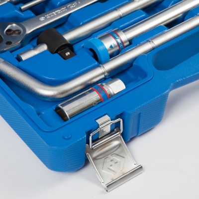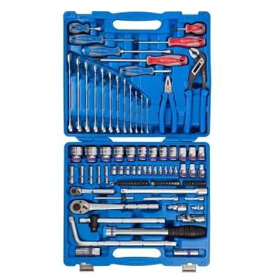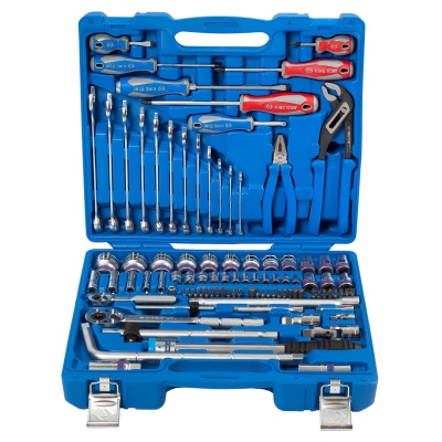 Набор из 97 инструментов и комплектующих от фирмы King Tony. Поставляется в ударопрочном пластиковом кейсе с металлическими защелками. Удобен в хранении и переноске. В составе: торцевые и свечные головки, трещотки и карданы, воротки и удлинители, переходник, комбинированные ключи, крестовые и шлицевые отвертки, вставки (биты), плоскогубцы и захват. Изделия обладает повышенной прочностью и применяются при различных профессиональных нагрузках.