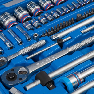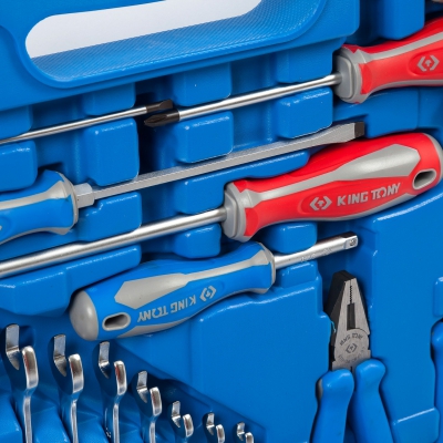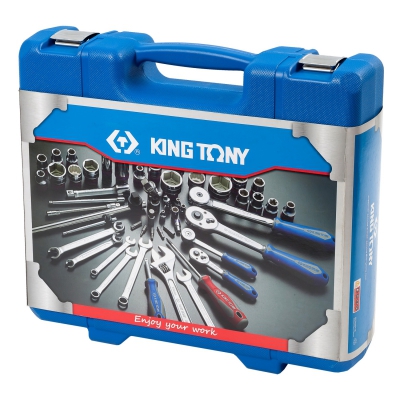 Набор из 97 инструментов и комплектующих от фирмы King Tony. Поставляется в ударопрочном пластиковом кейсе с металлическими защелками. Удобен в хранении и переноске. В составе: торцевые и свечные головки, трещотки и карданы, воротки и удлинители, переходник, комбинированные ключи, крестовые и шлицевые отвертки, вставки (биты), плоскогубцы и захват. Изделия обладает повышенной прочностью и применяются при различных профессиональных нагрузках.