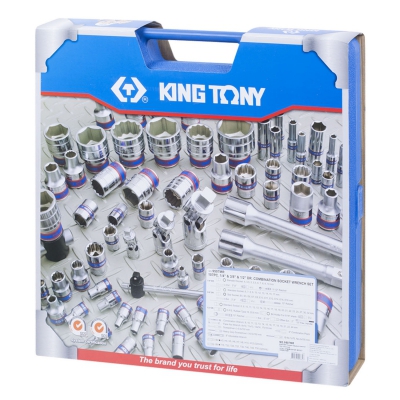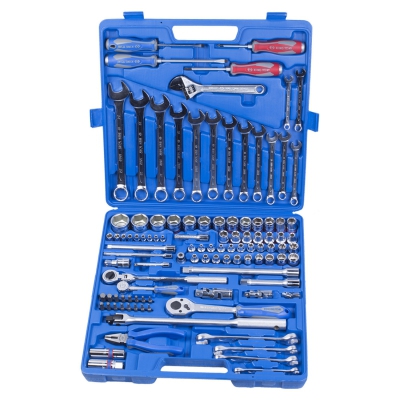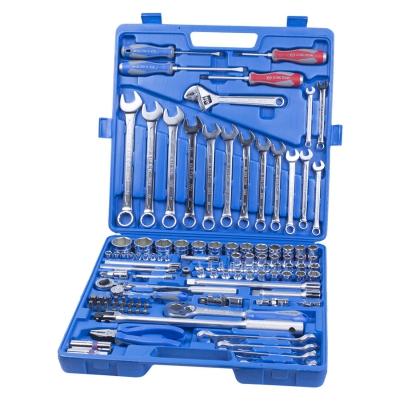Набор инструментов в ударопрочном пластиковом чемодане с металлическими защелками. 3 вида посадочных квадрата комплектующих. В комплект входят: торцевые и свечные головки, карданы и трещотки, удлинители, вставки и переходник к ним, крестовые и плоские отвертки, плоскогубцы, комбинированные, разводной и разрезные ключи. Инструменты применяются в быту или в ремонтных мастерских.