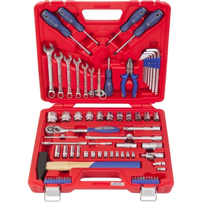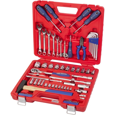 Универсальный набор фирмы МАСТАК. Размер посадочных квадратов комплектующих - 0,5 и 1/4 дюйма. Поставляется в ударопрочном пластиковом кейсе для удобства хранения и переноски. В комплекте: свечные и торцевые головки, удлинители и переходники, карданы и трещотки, воротки, крестовые и плоские отвертки, комбинированные ключи, вставки (биты), плоскогубцы, индикатор тока, шестигранники и молоток с нейлоновой защитой. Инструменты выдержат повышенные профессиональные нагрузки. Возможно применение в быту и в мастерских.