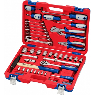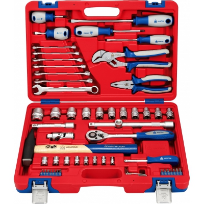 Универсальный набор МАСТАК для различных работ в быту или в ремонтных мастерских. В комплекте: стандартные шестигранные торцевые головки, удлинители, трещотка и кардан, вороток и переходники, комбинированные ключи, вставки (биты), плоские и крестовые отвертки, плоскогубцы и захват, молоток и шестигранники. Расположен в удобном чемодане с ударопрочными ребрами.