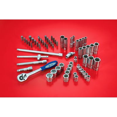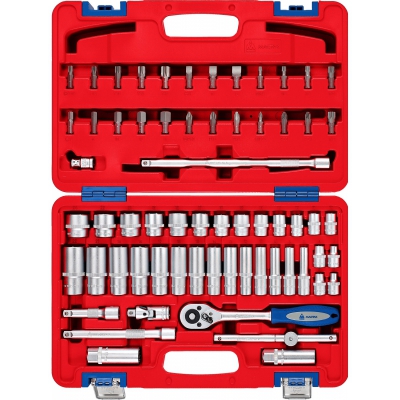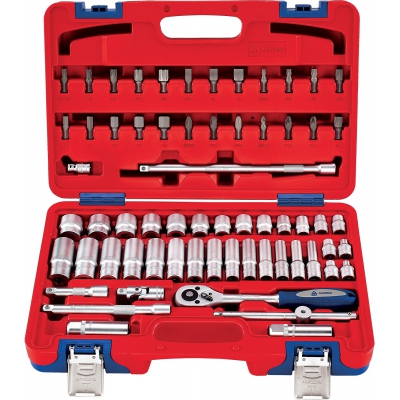 Универсальный набор фирмы МАСТАК. 64 инструмента и комплектующих. В составе: торцевые и свечные головки с посадочным квадратом 3/8 дюйма, трещотка и кардан, скользящий вороток, удлинители и переходник для бит, разнообразные вставки для работы с резьбовыми соединениями. Поставляется в удобном чемодане для хранения и транспортировки.
