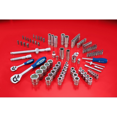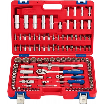 Набор инструментов для работы с резьбовыми соединениями. В состав входят: различные торцевые и свечные головки, трещотки и карданы, удлинители и переходники, воротки, вставки (биты) с 2 размерами посадочных квадратов. В комплекте ударопрочный кейс из пластика с металлическими защелками для удобства хранения и переноски. Возможно применение изделий при тяжелых нагрузках в мастерских.