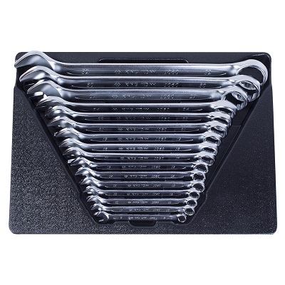 Набор комбинированных ключей из 16 предметов. Поставляется в ложементе для комплектования инструментальной тележки. Инструменты изготовлены из легированной стали методом высокотемпературной обработки. Наделены накидной и рожковой частью. Обеспечивают работу с резьбовыми соединениями в местах с различным доступом. Подходят для применения на СТО.