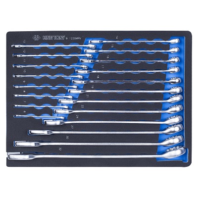 Набор комбинированных ключей в ложементе. Предназначен для комплектования инструментальной тележки. Инструменты наделены рожковой и накидной частью для работы с резьбовыми соединениями. Обеспечивают доступ к креплению в ограниченных местах. Изготовлены из прочной хром-ванадиевой стали. Возможно применение в быту или в автомастерских.