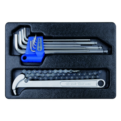 Набор из 10 предметов. Включает шестигранники Г-образной формы и цепной съемник масляного фильтра. Поставляется в ложементе для комплектования инструментальной тележки. Инструменты изготовлены из прочной легированной стали. Способны выдержать повышенные профессиональные нагрузки. Подходят для применения на СТО и в ремонтных мастерских.