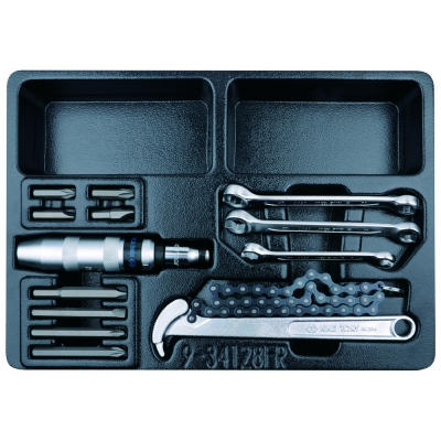 Набор в ложементе из 14 предметов. Используется для комплектования инструментальных тележек. Включает 3 комбинированных ключа с разрезным профилем, ударную отвертку с 8 вставками и цепной съемник масляных фильтров. Инструменты обладают повышенной прочностью. Способны выдержать профессиональные нагрузки в мастерских.