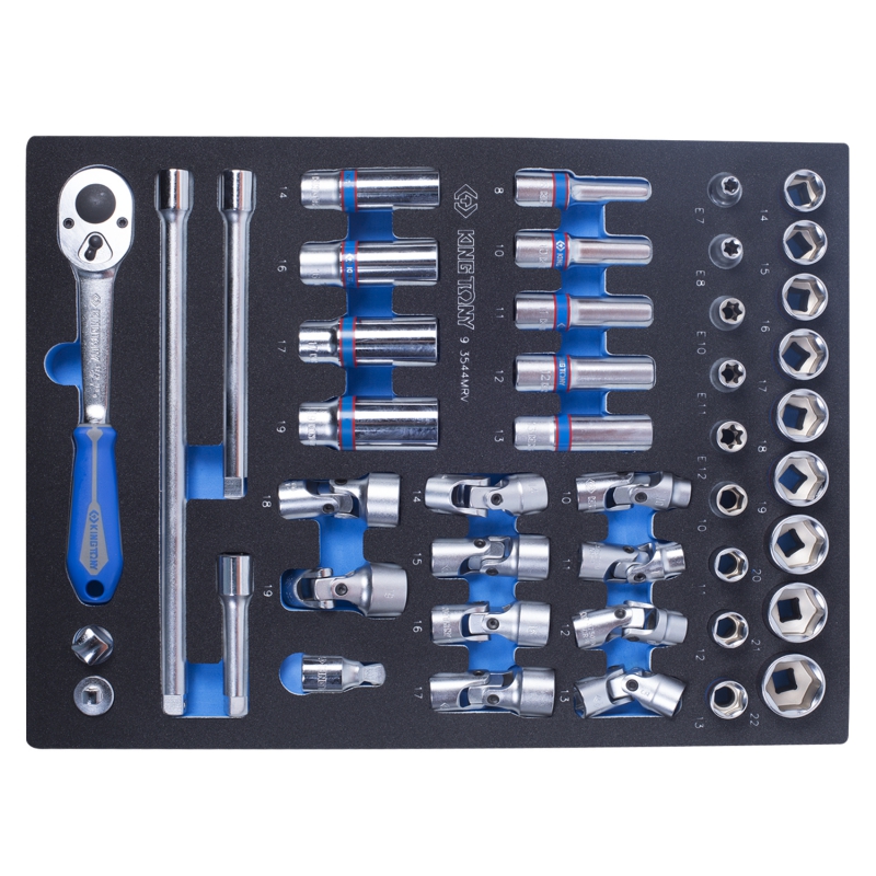 Набор King Tony состоит из торцевых головок, удлинителей, переходников и флажковой трещотки. Широко применяется в автомастерских и на производстве для демонтажа крепежных соединений. Оснащен ложементов из материала ЭВА, устойчивого к маслам и растворителям и обладающего высоким показателями прочности. Предназначен для комплектации инструментальных тележек.