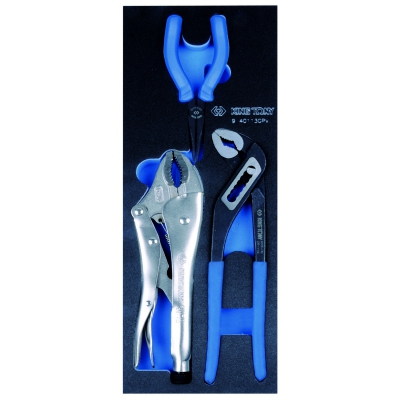 Комплект King Tony состоит из трёх изделий (захват переставной, тонконосые плоскогубцы, зажим с закруглёнными губами), которые используются для установки и удаления крепежей на механизмах, их составных частях, узлах и агрегатах. Ложемент для набора предназначается для оборудования инструментальной тележки и оснастки рабочих мест на производственных объектах.