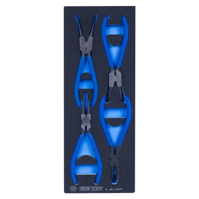 Комплект съёмников стопорных колец King Tony состоит из 4 инструментов с возвратной пружиной и отжигом рабочих поверхностей (для сжатия, разжатия, прямые, загнутые), применяется на СТО, в сервисных центрах, автомастерских, а так же на производственных предприятиях, используется для ремонта и обслуживания автомобилей и спецтехники. Ложемент для набора изготовлен для оснастки инструментальных тележек.