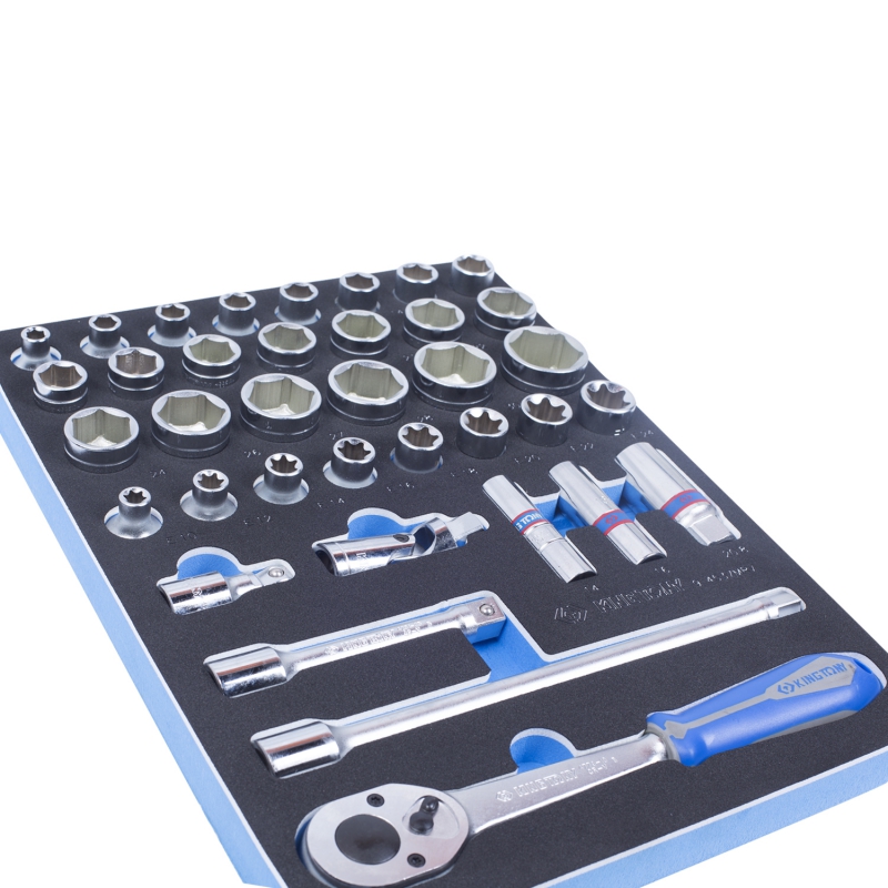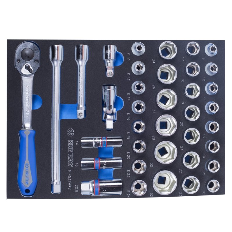 Набор King Tony состоит из торцевых и свечных головок, кардана, удлинителей и флажковой трещотки. Предназначен для демонтажа крепежных соединений. Широко применяется на производстве и в автомастерских. Инструменты выполнены из хром-ванадиевой стали, устойчивой к коррозии и повреждениям. Ложемент из материала ЭВА способен возвращать свою форму после деформации. Служит для комплектации инструментальных тележек.