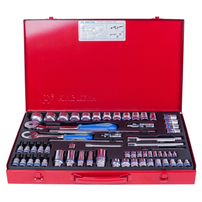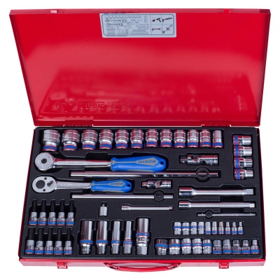 Набор торцевых головок с принадлежностями в металлическом кейсе. Включает стандартные, свечные и глубоки головки, карданы и переходники, воротки и удлинители. Предназначен для работы с различными резьбовыми соединениями. Обеспечивает доступ к детали в ограниченных условиях. Возможно применение совместно с электрическим или пневматическим инструментом. Подходит для СТО и мастерских.