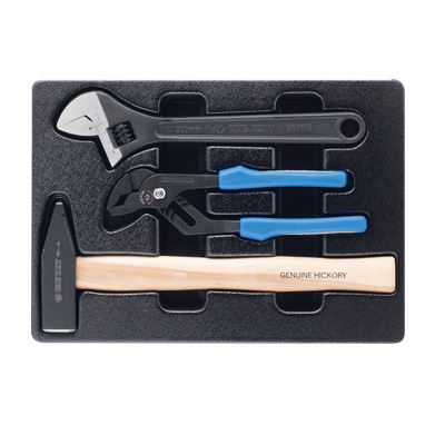 Набор King Tony состоит из трёх инструментов (молоток европейского типа, разводной ключ, захват переставной), предназначенных для работы с трубными конструкциями, крепёжными элементами, а так же для других слесарных и монтажных работ. Расположение комплекта в ложементе позволяет оборудовать инструментальную тележку и грамотно оснастить рабочее место. Эксплуатируется на различных производственных объектах.