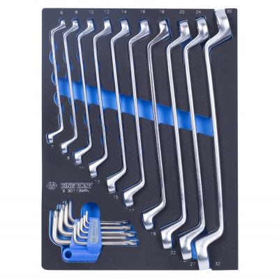 Набор накидных ключей и L-образных TORX для инструментальной тележки. Расположен в ложементе из этиленвинилацетата и ЭВА с обозначением размерности. Инструменты обладают повышенной прочностью. Обеспечивают работу с резьбовыми соединениями при различных условиях. Возможно применение в ремонтных и автомобильных мастерских.