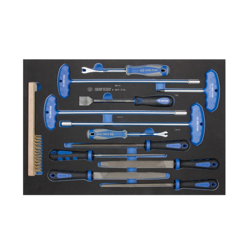 Комплект King Tony имеет широкий спектр использования – от мелкого домашнего ремонта, до решения сложных производственных задач. В наборе представлено несколько видов напильников, торцевых отверток, съемников клипс и металлическая щетка. Инструменты находятся на легком пластиковом ложементе, который удобен для хранения. Идеален для установки в инструментальную тележку.
