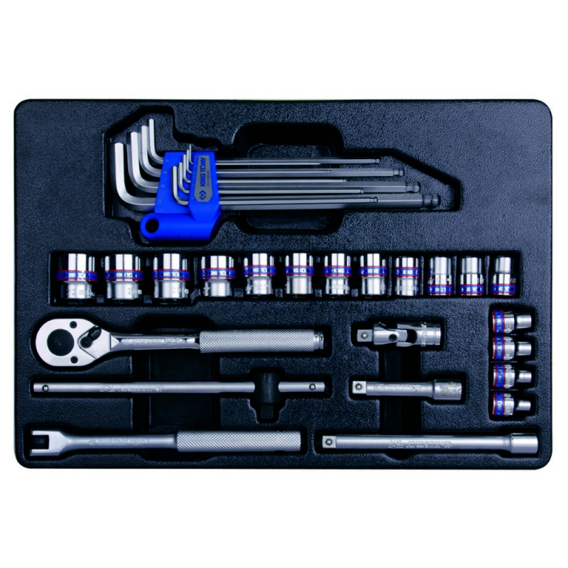 Набор King Tony широко применятся в автосервисах, мастерских и на станциях ТО для комплектации инструментальных тележек. Состоит из торцевых головок, г-образных шестигранников, удлинителей, кардана, флажковой трещотки, шарнирного и скользящего воротков. Инструменты выполнены из качественной и прочной стали. Располагаются на удобном ложементе.