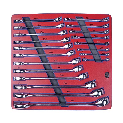 Набор комбинированных ключей для работы с резьбовыми соединениями. Поставляется в ложементе для комплектования инструментальной тележки. Изделия наделены рожковой и накидной частью. Изготовлены из хром-ванадиевого сплава легированной стали. Защищены от коррозии и повреждений. Подходят для применения в быту или в автомастерских.
