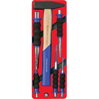 Набор ударных инструментов и режущих изделий МАСТАК предназначен для оборудования инструментальной тележки, слесарного верстака и организации рабочего места, состоит из 6 элементов (молотка, зубил и выколоток разных размеров, кернера). Эксплуатируется в сфере автосервиса (на СТО, ремонтных станциях, гаражах), а так же в промышленных помещениях и столярных мастерских.