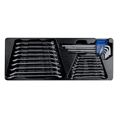 Универсальный набор инструментов с выдвижными ящиками. Предназначен для оснащения ремонтных мастерских. Включает торцевые и свечные головки, насадки, удлинители, воротки и трещотку, кардан, разводной и комбинированные ключи, отвертки и шестигранники, захват и плоскогубцы. Инструменты способны выдержать повышенные профессиональные нагрузки.
