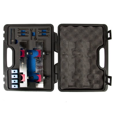 Набор фиксаторов распредвала и коленвала из 15 предметов. Предназначен для фиксирования механизмов при проведении ремонтных работ двигателя Mercedes Benz. Поставляется в удобном кейсе для хранения и переноски. Инструменты наделены повышенной прочностью. Подходит для применения на СТО.