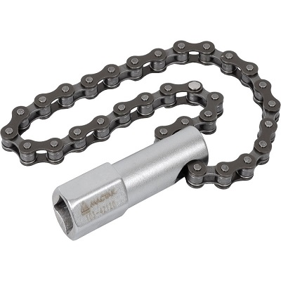 Съемник для установки и снятия масляных фильтров. Наделен высокопрочной цепью для плотного захвата детали до 120 мм. Обладает повышенными физическими свойствами. Защищен от коррозии и повреждений. Подходит для применения в профессиональных мастерских.