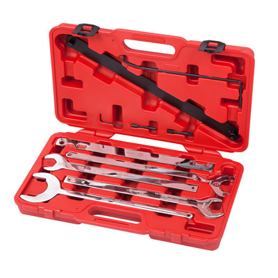 Комплект ключей из инструментальной стали с хромированным и оксидированным покрытием включает в себя десять изделий, предназначается для работы с термомуфтами при проведении ремонта и обслуживания автомобилей немецких и американских марок. Эксплуатируется на объектах профессионального автосервиса (СТО, автомастерские, сервисные центры, ремонтные базы), а так же в частных гаражах.