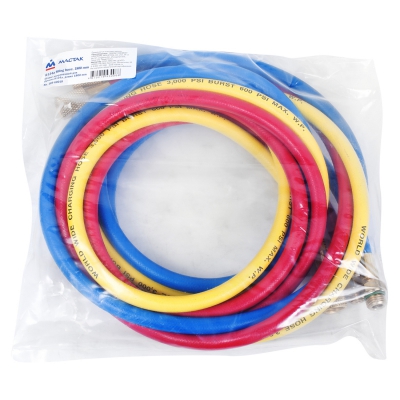 Набор шлангов (L=150 см) состоит из трёх изделий жёлтого, синего и красного цвета с металлическими адаптерами, предназначенных для заправки автомобильных систем кондиционирования фреонами различных типов. Шланги снабжены переходниками американского стандарта с трапецеидальной резьбой. Эксплуатируется в сфере профессионального автосервиса.