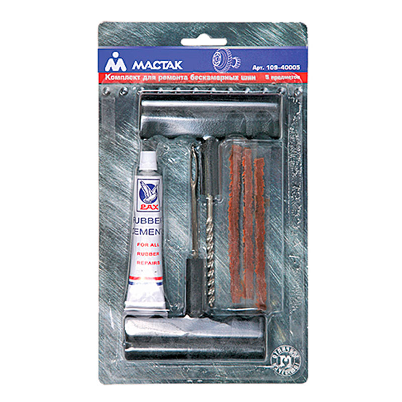 Набор Мастак включает в себя специнструменты с витым и игольчатым наконечниками, клей и жгуты. Используется в шиномонтажных мастерских и автосервисах при проведении работ по ремонту бескамерных шин. Также подходит для самостоятельного применения. Обеспечивает хорошую герметизацию.