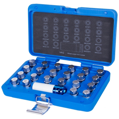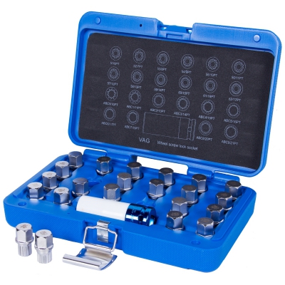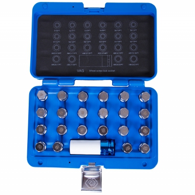 Комплект King Tony (23 изделия) из высококачественного инструментального сплава CrMo (хром-молибден) состоит из тонкостенной торцевой головки с пластиковой защитой и насадок различных размеров и профилей. Предназначается для затяжки и раскрутки секреток на колёсных дисках, подходит для большинства моделей марки Volkswagen, применяется в сфере профессионального автосервиса и в личных гаражах.