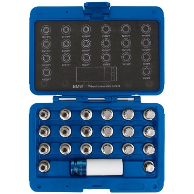 Комплект King Tony (21 элемент) из высококачественного инструментального сплава CrMo (хром-молибден) состоит из тонкостенной торцевой головки с пластиковой защитой и насадок различных размеров и профилей. Предназначается для затяжки и раскрутки секреток на колёсных дисках, подходит для большинства моделей марки BMW, используется на СТО, в сервисных центрах, автомастерских и личных гаражах.