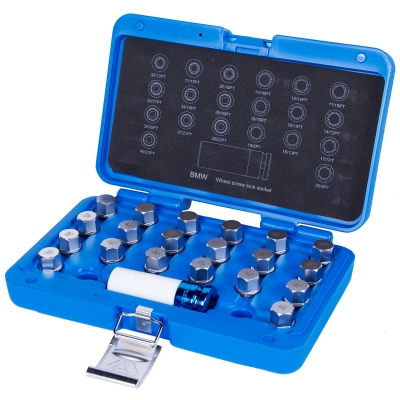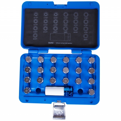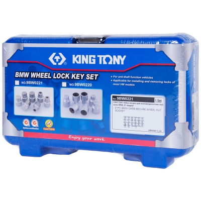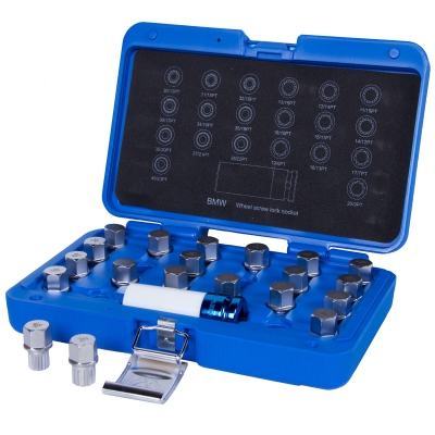 Комплект King Tony (21 элемент) из высококачественного инструментального сплава CrMo (хром-молибден) состоит из тонкостенной торцевой головки с пластиковой защитой и насадок различных размеров и профилей. Предназначается для затяжки и раскрутки секреток на колёсных дисках, подходит для большинства моделей марки BMW, используется на СТО, в сервисных центрах, автомастерских и личных гаражах.