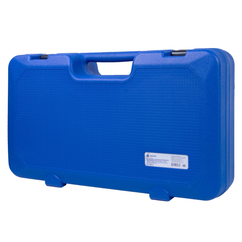 Набор торговой марки Мастак состоит из оправок, болтов, гидравлического цилиндра и муфты. Используется для монтажа и демонтажа сайлентблоков переднего подрамника в условиях автосервисов и станций техобслуживания. Подходит для автомобилей производства Mercedes Benz. Изделия выполнены из стали высокого качества. Кейс обеспечивает удобство при хранении инструментов.